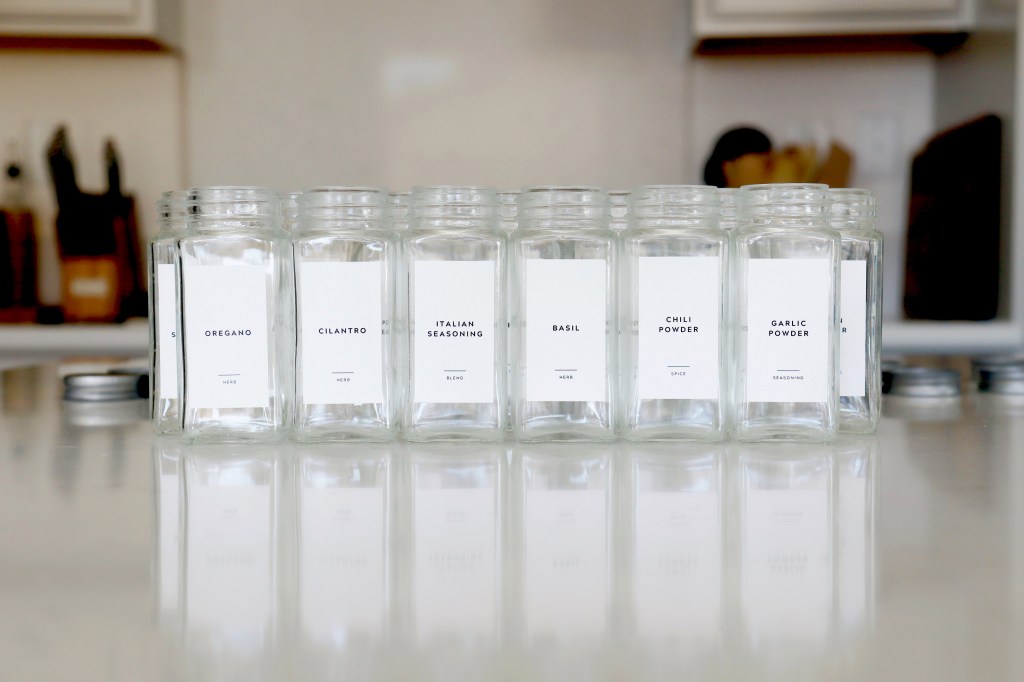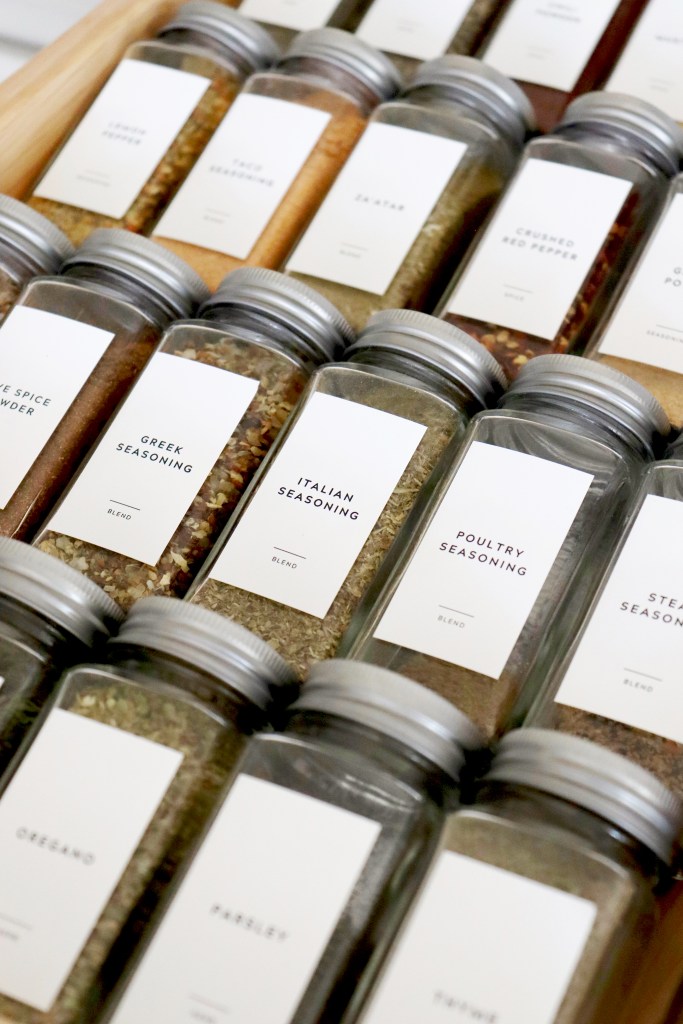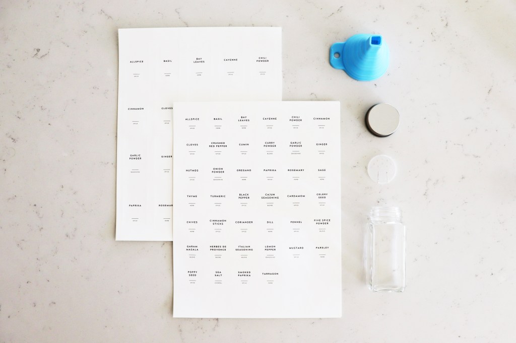 I started by purchasing some glass spice jars and a spice tray insert from Amazon. There were so many jar options available, but I chose the square/rectangular jars that wouldn’t roll around easily in the drawer (Does anyone else get nervous from the sound of glass clanking?). The jars came with a collapsible silicone funnel, pre-printed clear labels for the jars (not pictured in this post), pre-printed chalk labels for the lids (not pictured in this post), extra labels, and a chalk marker; HOWEVER, I decided to order some cute contemporary spice labels from Etsy instead (pictured below) and love how they look! The spice tray insert is also optional, but it helps position the jars at an angle so that they’re easier to grab from the drawer.