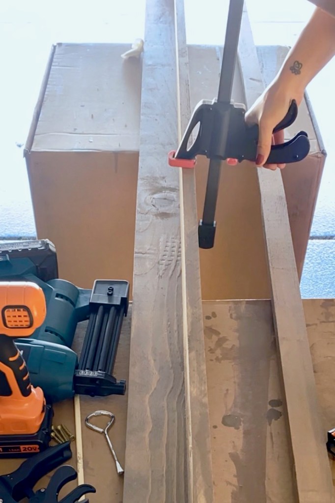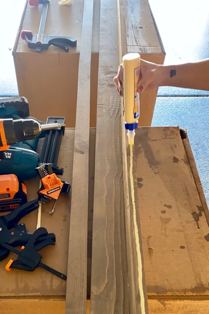 I let the wood stain sit and dry overnight. The next day, I applied wood glue to the bottom front of the 2″ x 4″ board, gently placed the side of the 2″ x 3″ up against that section to create the base of my picture ledge, and clamped the pieces together. I also used corner clamps to ensure that the pieces were aligned well.