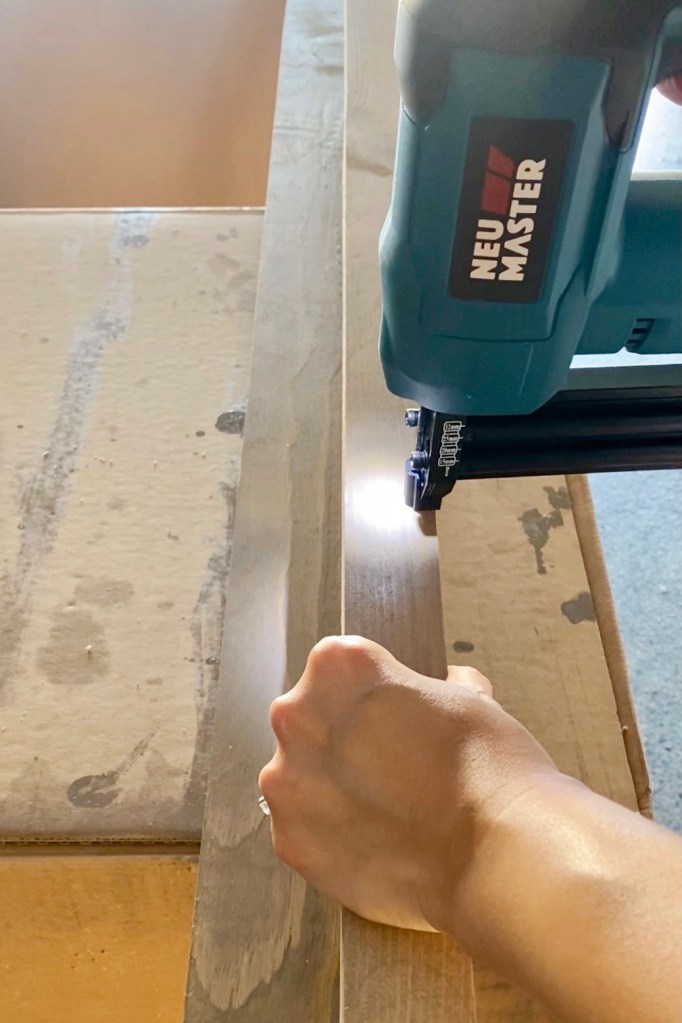 I sanded down each side using my orbital sander with 80 grit to remove imperfections, then with 120 grit to smooth out the surface for even staining.