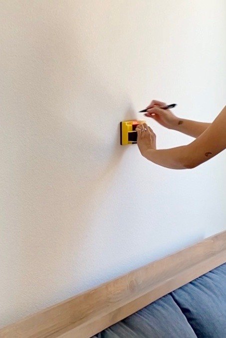 I found and marked my studs using my stud finder. Then I attached the picture ledge to the wall, using a single screw into the stud closest to the center of the picture ledge. This allowed me to level out my picture ledge and make minor adjustments easily while having the picture ledge already secured to the wall. While keeping the picture ledge level, I inserted more wood screws where my studs are located to attach the picture ledge securely to the wall.