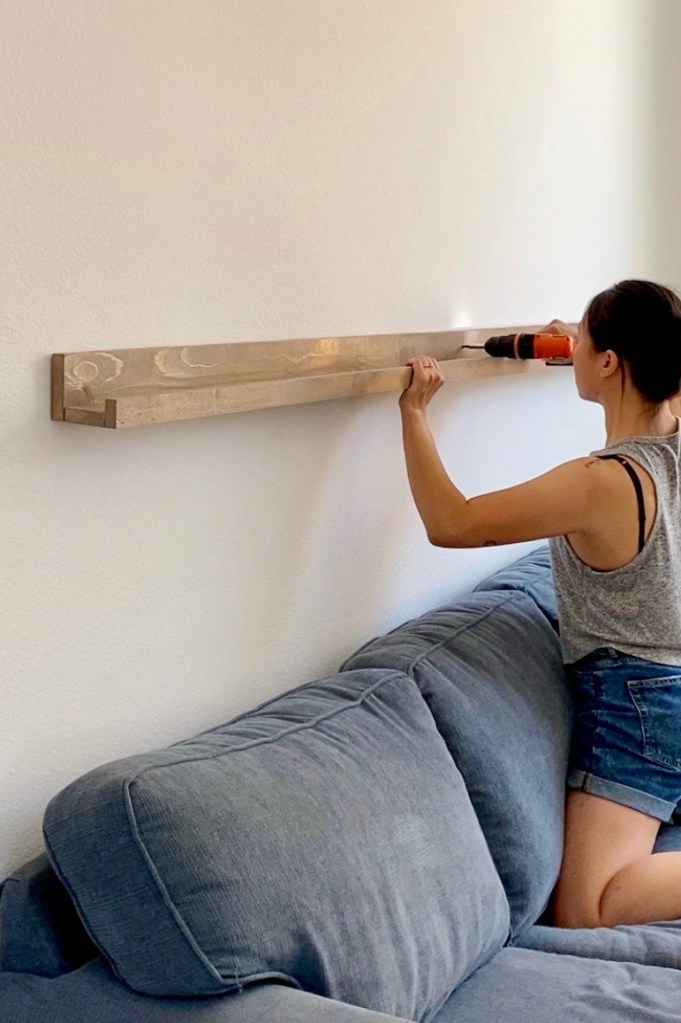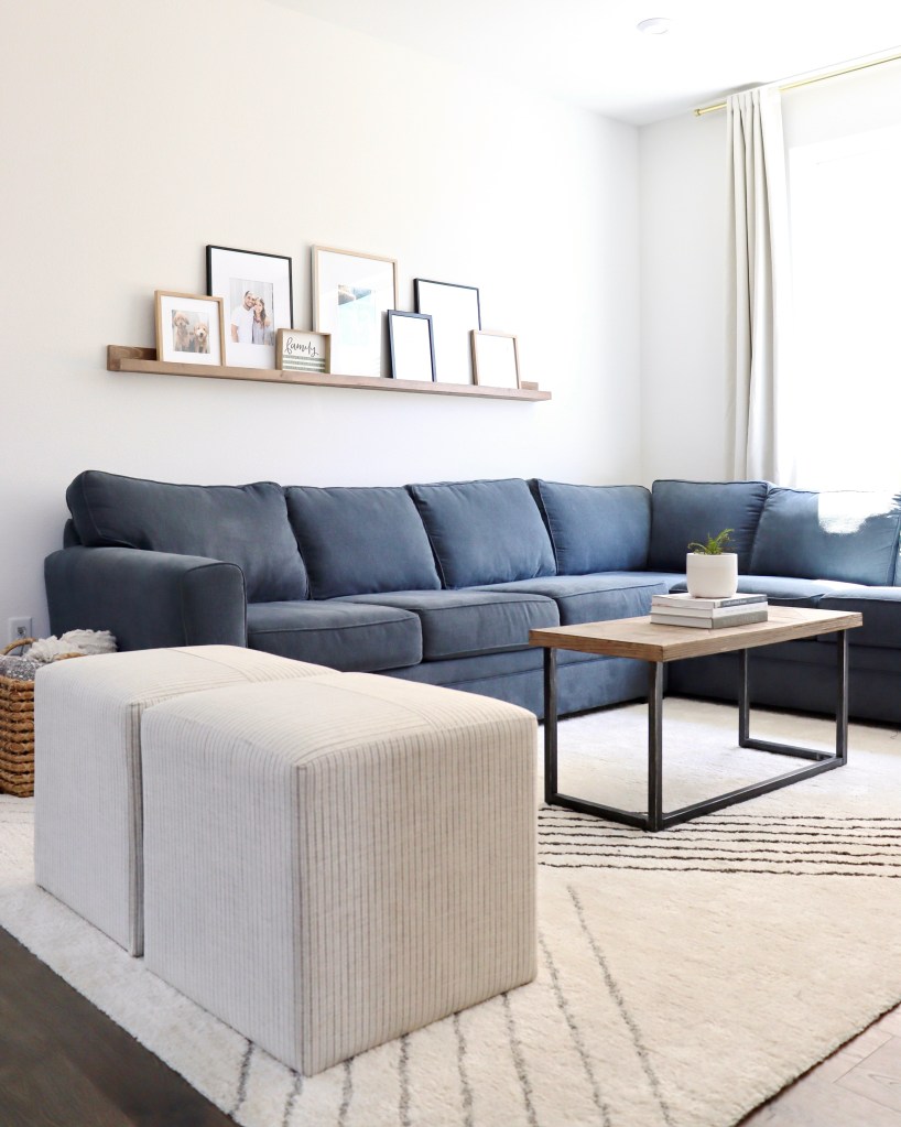 I’ve always loved the look of a picture ledge above a living room sofa but have always found them to be a little on the pricier side. I wanted a picture ledge that extends across 2/3 to 3/4 the length of my couch. For the sectional in our front living room, my ideal picture ledge would be approximately 7′ (or 84″) long. An 84″ picture ledge goes for about $130 on Etsy. A 72″ picture ledge goes for about $70 on Amazon. I decided to make my own for around $15.
