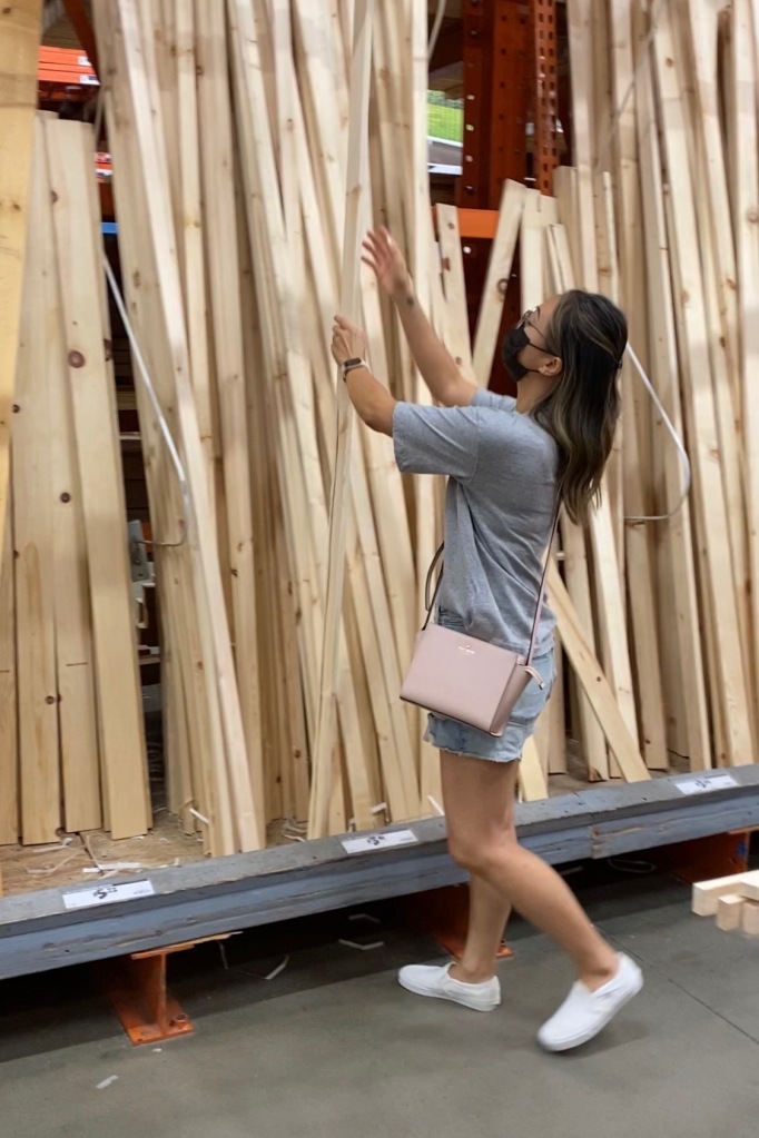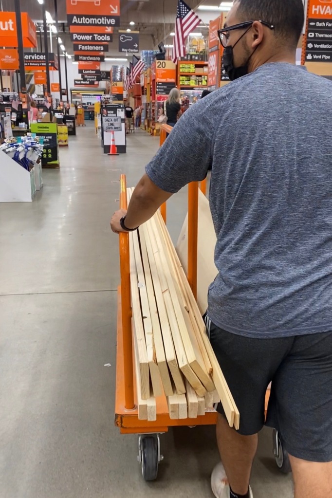 We started off by purchasing the wood for the specific design we wanted to create. Your shopping list will vary from ours based on your desired wood panel pattern. We purchased several 1″ x 2″ and 1″ x 4″ common boards from Home Depot. While we’re on the topic of common boards… If you haven’t gotten a chance to watch my Instagram post on how to select the best common board for wood projects, click here to take a look!