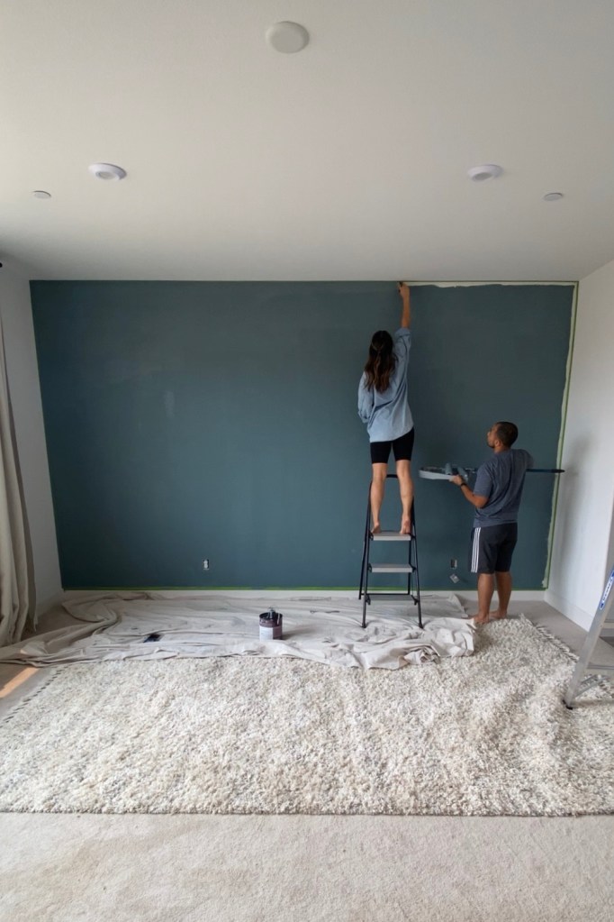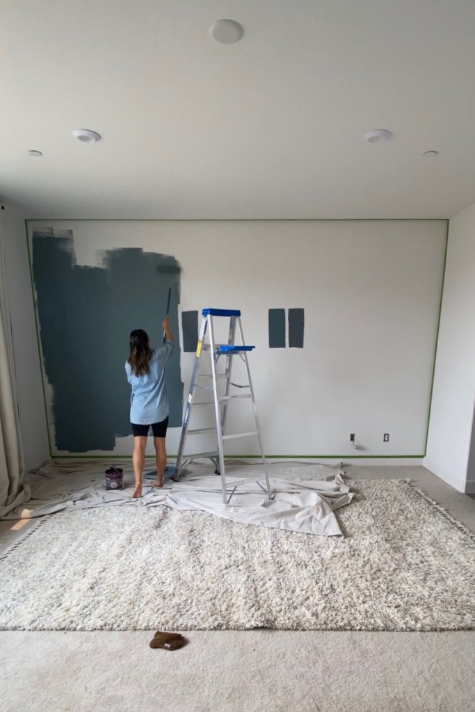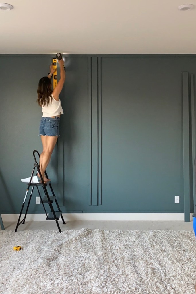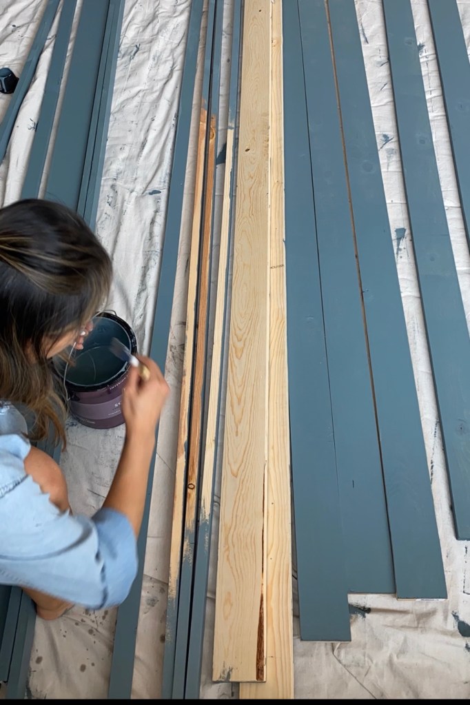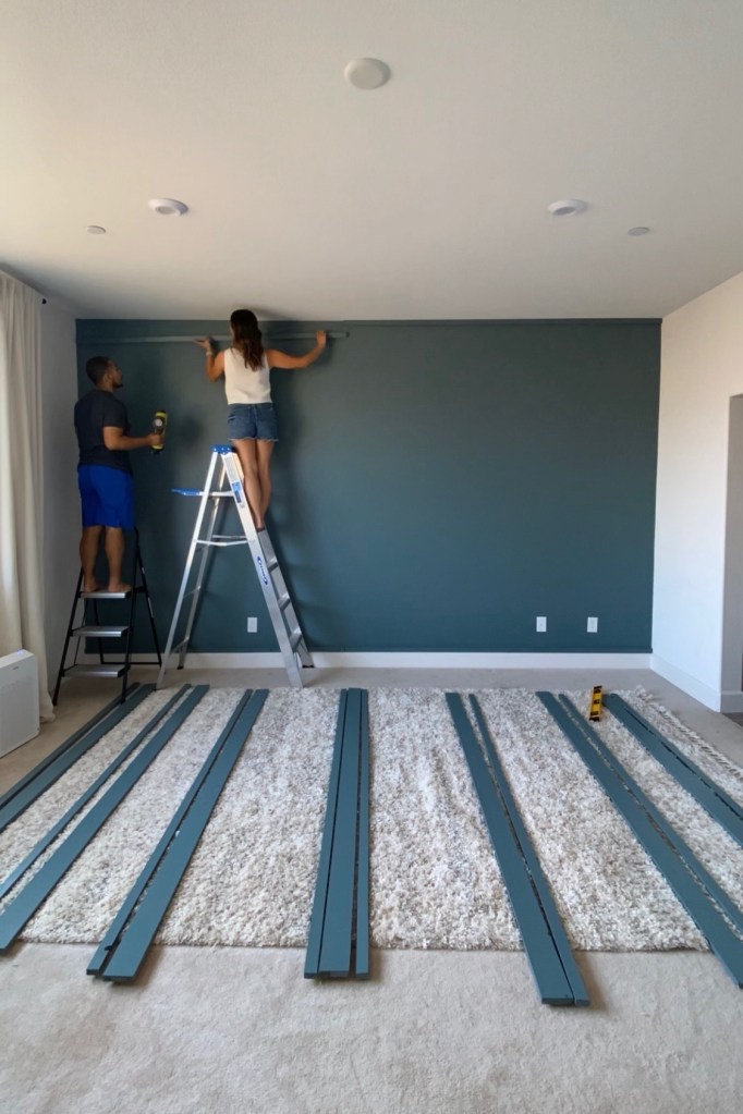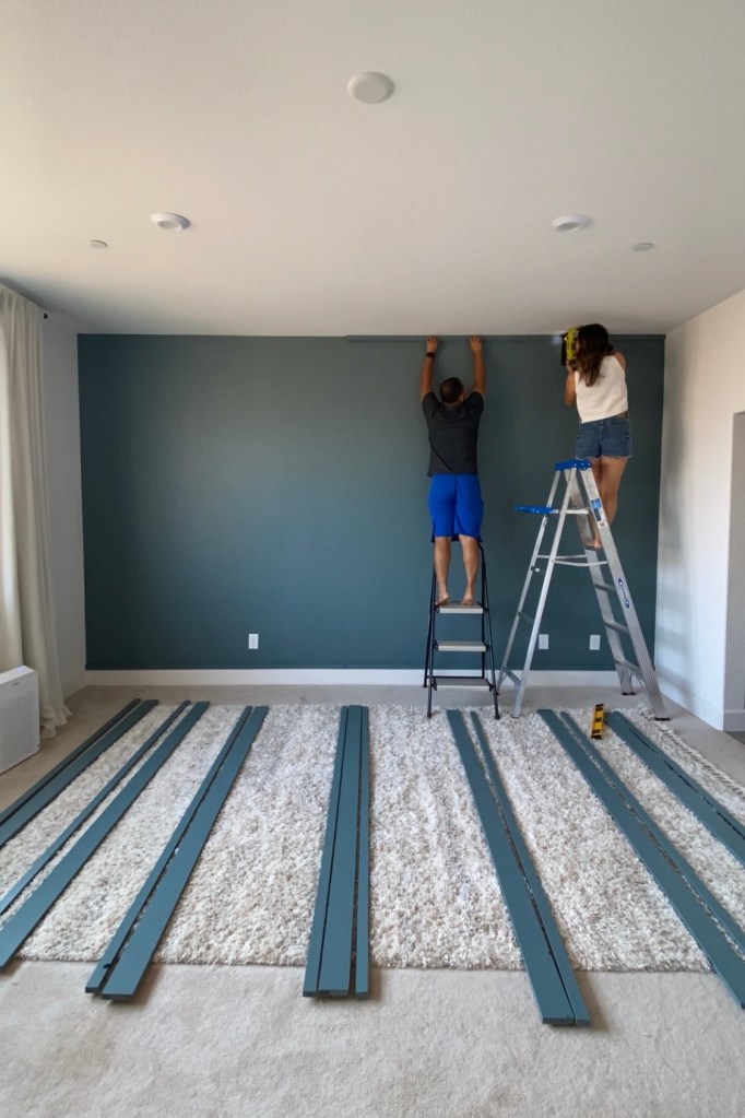 Before installing the wood panels, I had to paint the wall. I taped the baseboards, edges, and ceiling to keep those white (Sherwin Williams Snowbound). Then I painted the entire wall with 2 coats of Behr Coney Island, a muted blue/green. THANK YOU to all of you who helped me pick a color on my Instagram poll! The 49% vs 51% split between Behr Ocean Swell (charcoal blue) and Behr Coney Island did not make the decision any easier for me to make! Ultimately, I decided to go with Coney Island to add some color and liveliness to our home while still creating a serene and relaxing space. Let me just tell you now… I am LOVING this color! Absolutely LOVING it!