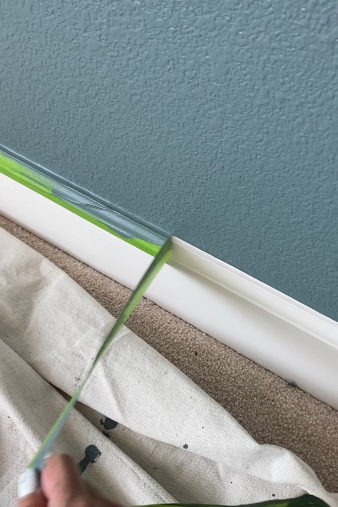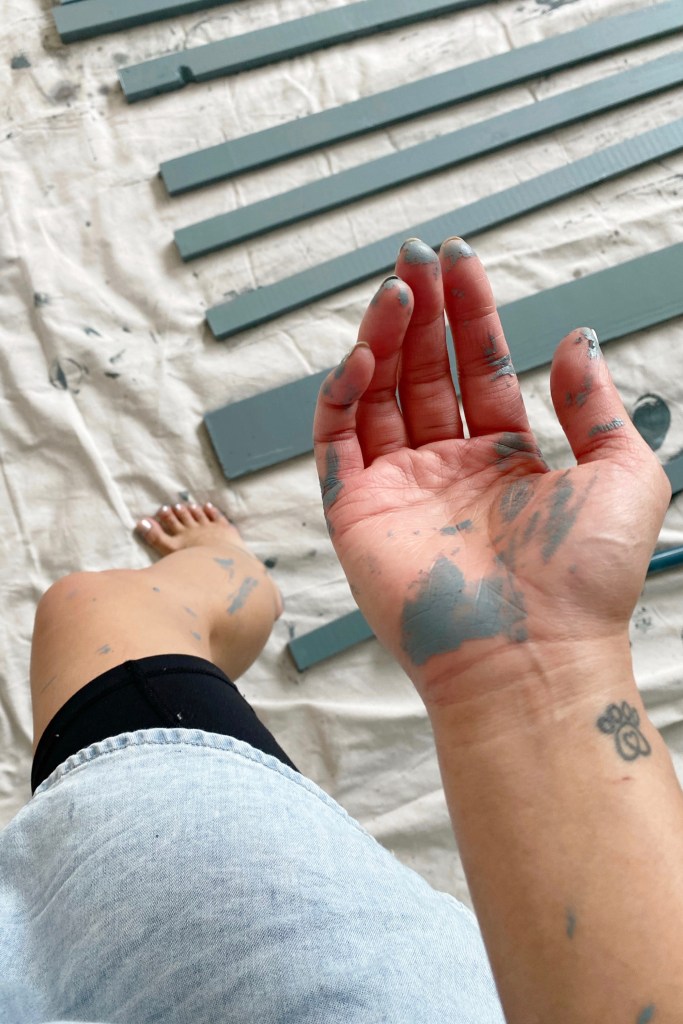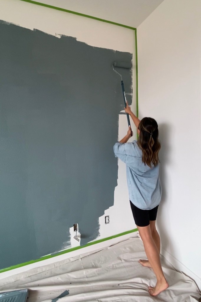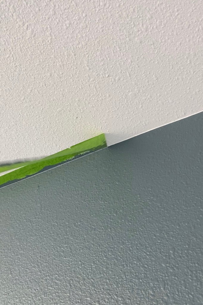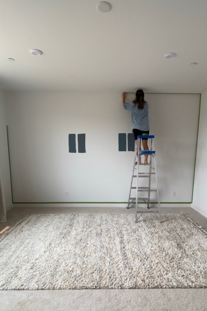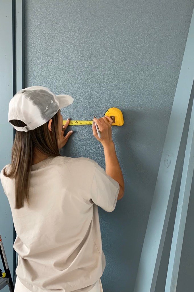 Before installing the wood panels, I had to paint the wall. I taped the baseboards, edges, and ceiling to keep those white (Sherwin Williams Snowbound). Then I painted the entire wall with 2 coats of Behr Coney Island, a muted blue/green. THANK YOU to all of you who helped me pick a color on my Instagram poll! The 49% vs 51% split between Behr Ocean Swell (charcoal blue) and Behr Coney Island did not make the decision any easier for me to make! Ultimately, I decided to go with Coney Island to add some color and liveliness to our home while still creating a serene and relaxing space. Let me just tell you now… I am LOVING this color! Absolutely LOVING it!