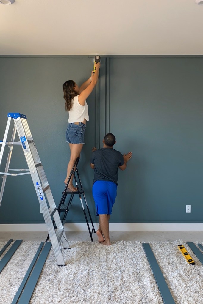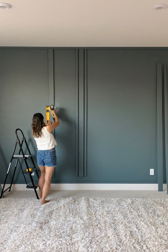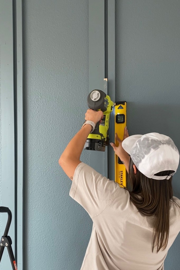 To install the wood panels, we measured the length of the wall and divided it by 2 to find the center. We used our brad nailer to nail the first 1″ x 4″ piece to the center of the wall while carefully making sure that this piece was level. Then we nailed the other 1″ x 2″ pieces to each side of the center 1″ x 4″ piece, using a 1″ x 2″ piece (turned on its other side) as a spacer, and double checking that each piece was level.