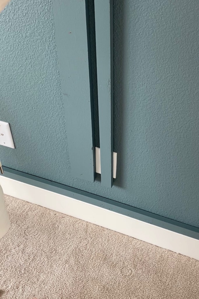 Because common boards are usually 8′ in length and my walls are 9’ tall, my wood panels didn’t quite extend across the entire height of the wall. Even with the baseboard and the frame that I installed earlier, each board was just a few inches shy of reaching the other end… So I painted some extra wood, measured each space, cut the boards accordingly, and nailed the smaller pieces to the wall to fill in that space.