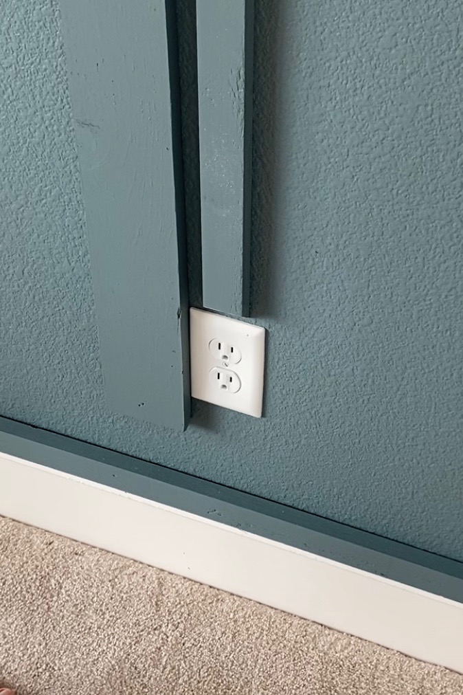 Unfortunately because of the spacing of my wood panel groupings, one of the 1″ x 2″ pieces aligned perfectly with an outlet. To fix this issue, I marked the 1″ x 2″ where it meets the edge of the outlet and trimmed it with my miter saw.