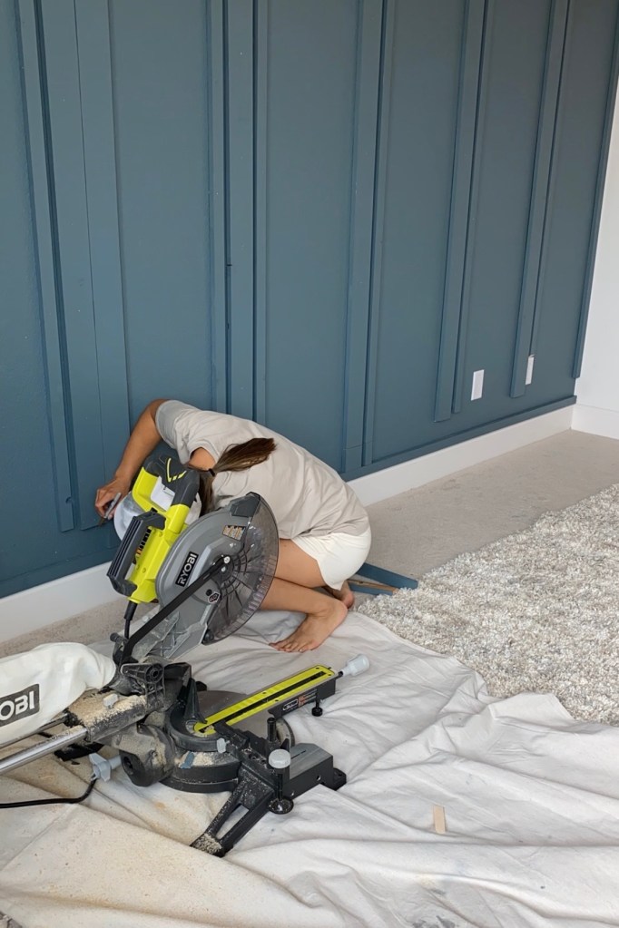 The next day, I began nailing my boards to the wall. I started with the borders/frame of the wood panel accent wall: a horizontal piece above the baseboard, a horizontal piece along the ceiling, and a vertical piece along each adjacent wall. I had to trim the horizontal pieces with my miter saw for them to fit the length of our accent wall.