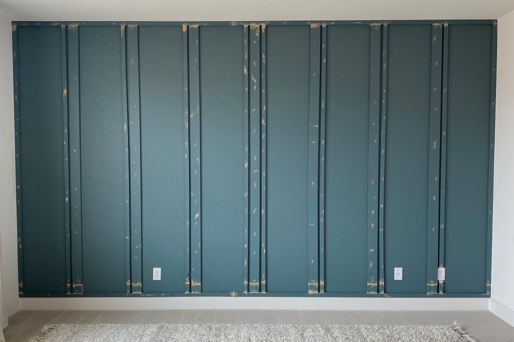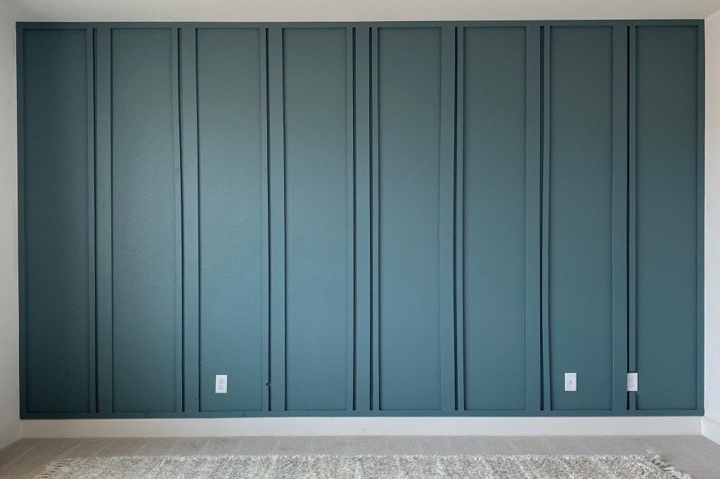 Many people recommend using primed MDF (Medium Density Fiberboard) for painted wood panel projects because they are inexpensive, smooth, and paintable with minimal defects and imperfections. I chose common board because I’m comfortable with it (I’ve never used MDF) and because common board can be slightly more affordable than MDF; however, after completing this project, I noticed that some of the wood textures and knots can be seen through the paint. For future wood panel accent walls, I will most likely choose smooth MDF boards, despite the extra cost, for an even cleaner look.