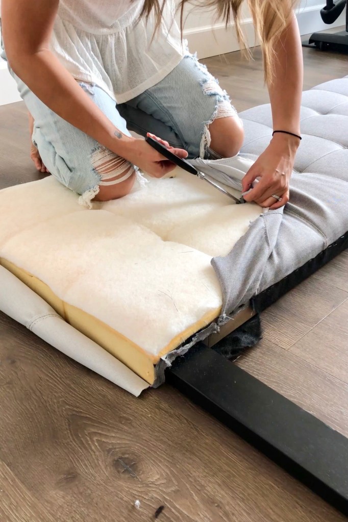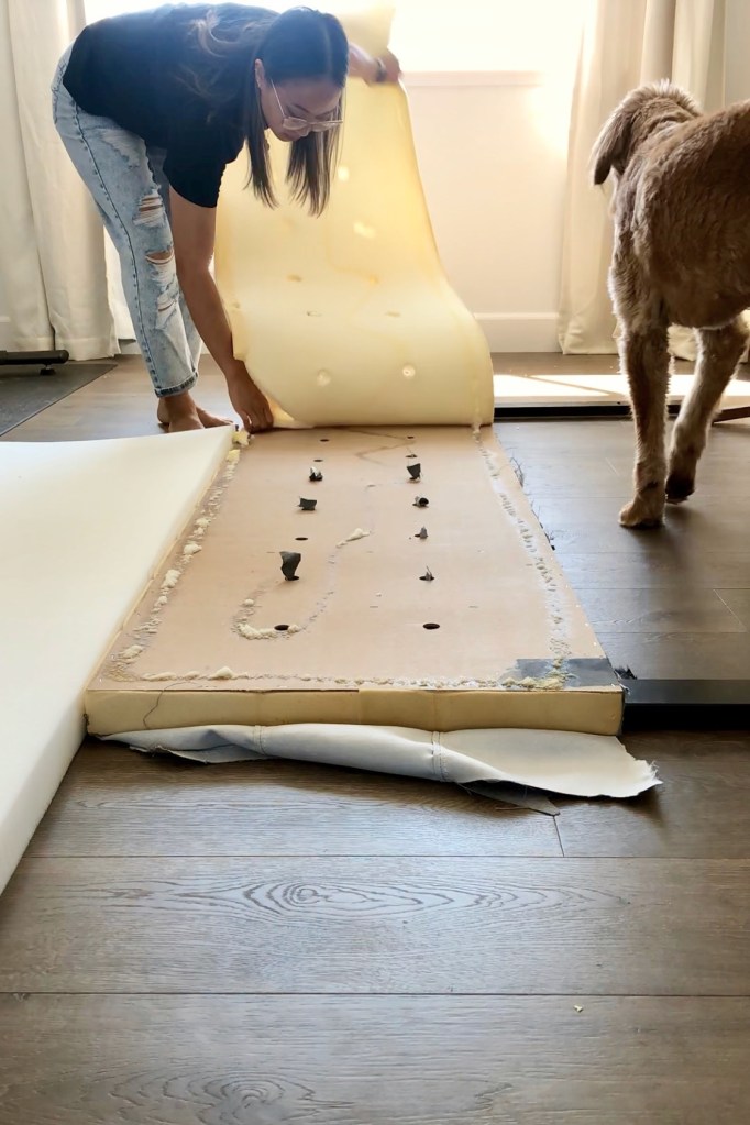 Then I removed the old batting and foam cushion. I could have reused the cushion, but this cushion had too many holes from the tufts that would most likely show through the fabric. I purchased a new foam cushion on Amazon that was the exact length of my headboard.
