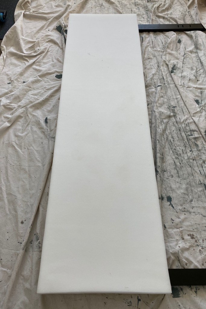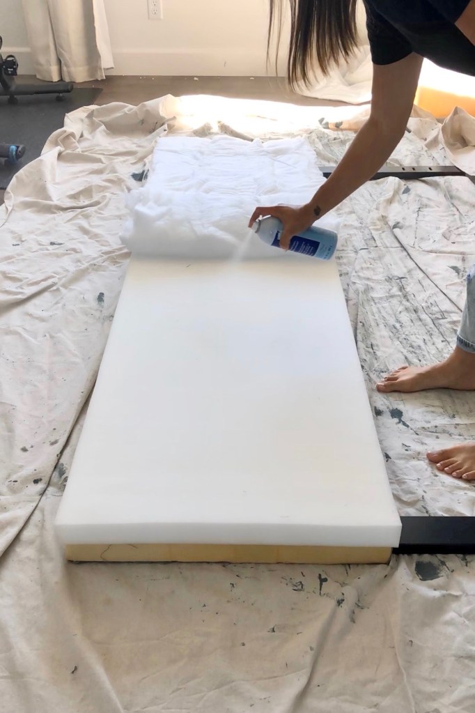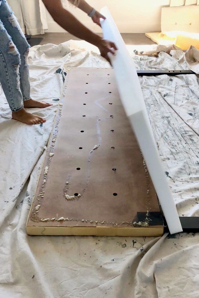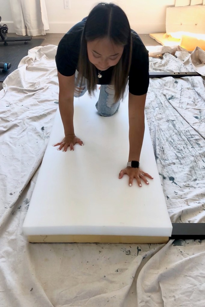 I applied adhesive spray to the wooden board, carefully positioned my foam cushion over the headboard, and applied pressure over it (more like I crawled over it) to secure it in place. THIS DID NOT WORK! The foam cushion came right off. I tried liquid nails instead, and that didn’t work either! The foam just absorbed all of the glue! After completing this project, I found out that some people use double-sided carpet tape to secure the foam cushion to the headboard. What a great idea!