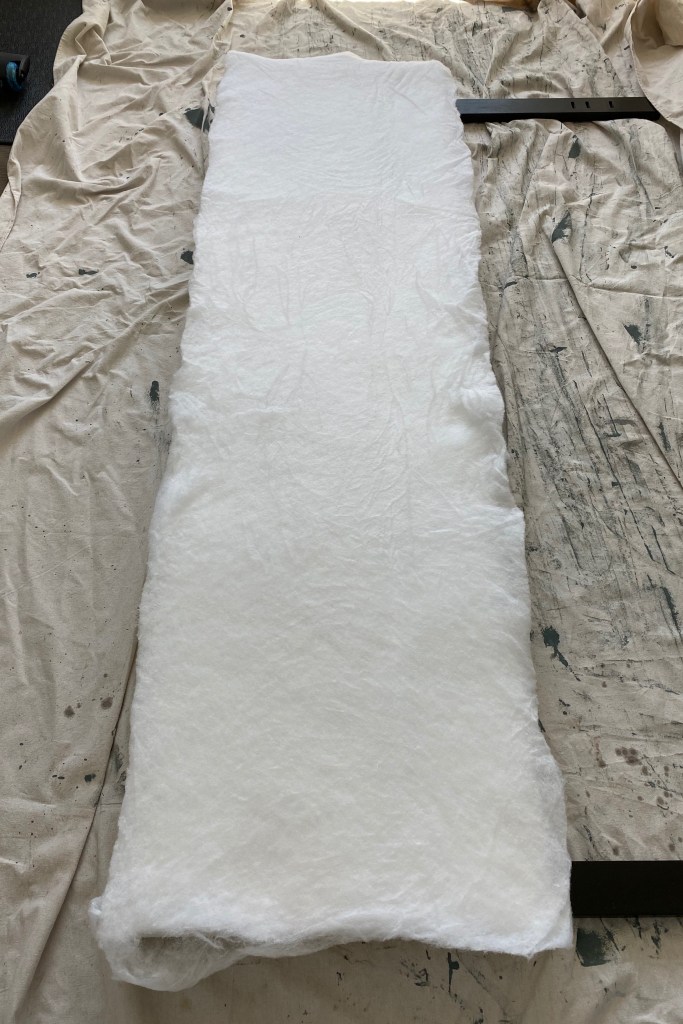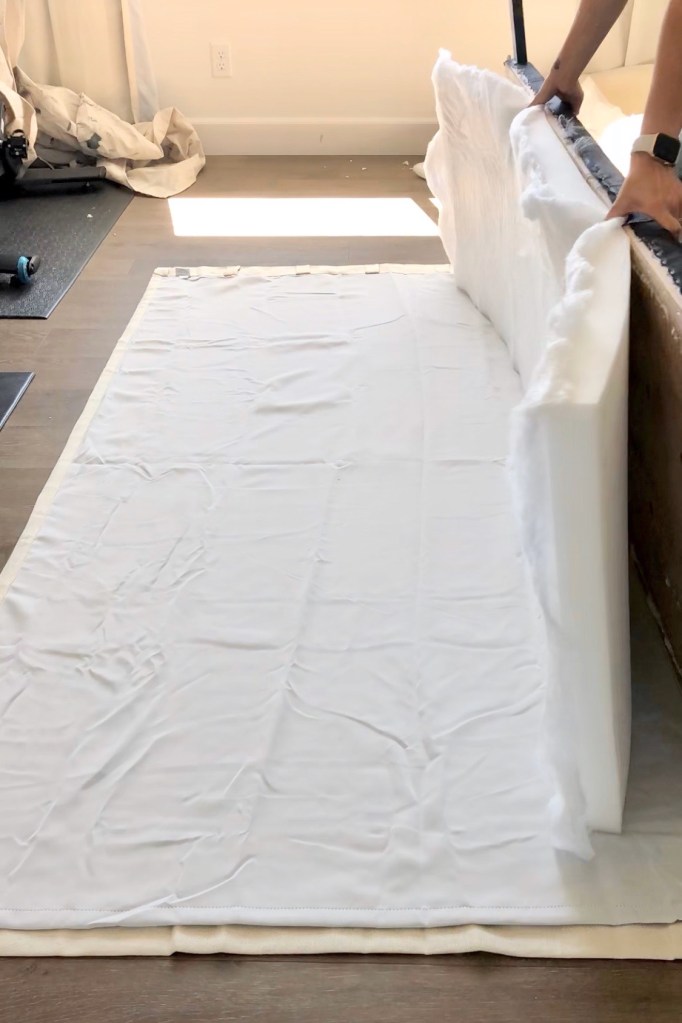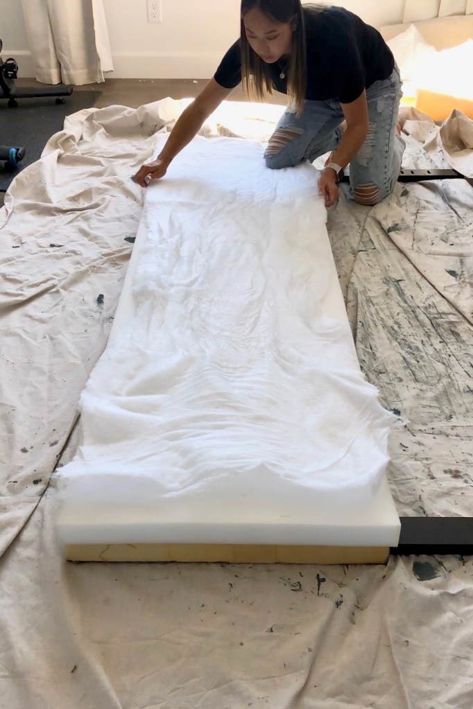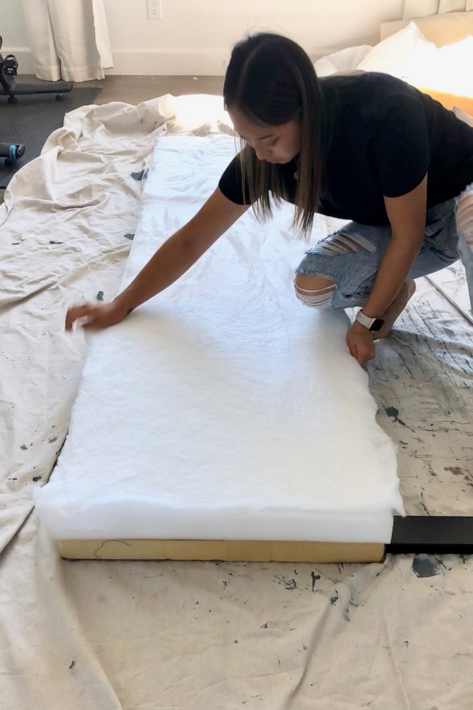 Next, I carefully put on my layer of batting. I’m not sure if this step was really necessary… I mainly did it because my headboard originally came with a layer of batting (that I ripped off) and because this was listed as a step in several tutorials. Apparently, batting prevents the fabric from slipping against the cushion and helps the headboard look more “fluffy.” I’m not sure my fabric would have slipped very much without it, and my headboard doesn’t look any flufflier with it… but I did it anyway!