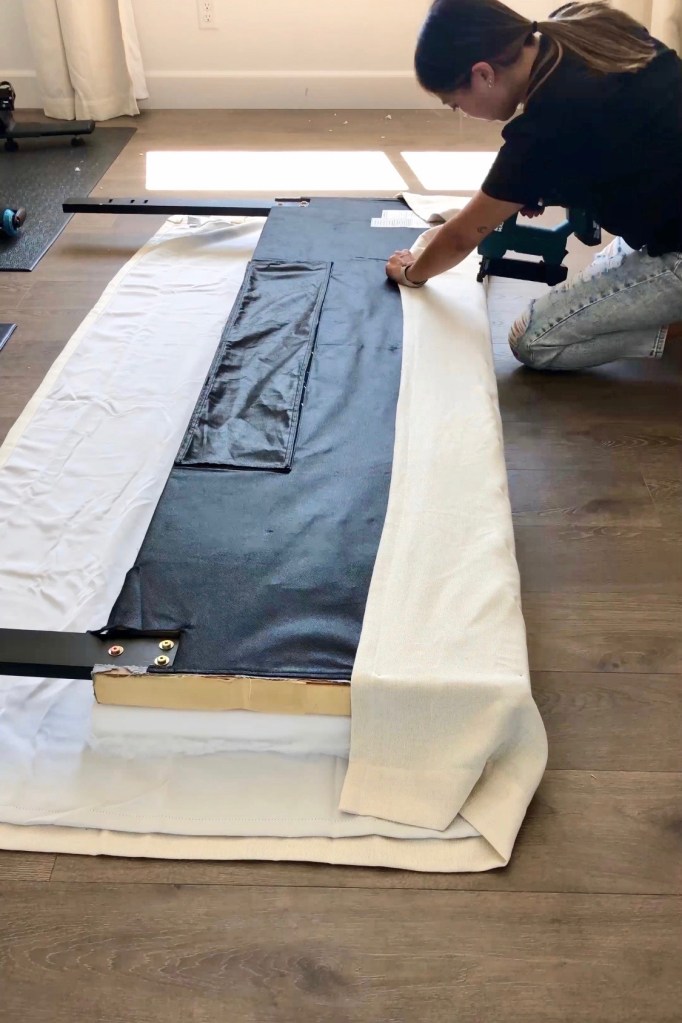 Next, I folded the curtain panel over each side, pulled the fabric tot, and stapled the fabric to the headboard. I learned later on that I had pulled my fabric too tightly and created mild indentations in my foam (pictured later in this post). I recommend pulling your fabric tightly but very gently over each edge without distorting the shape of the foam cushion to avoid making the same indentations.