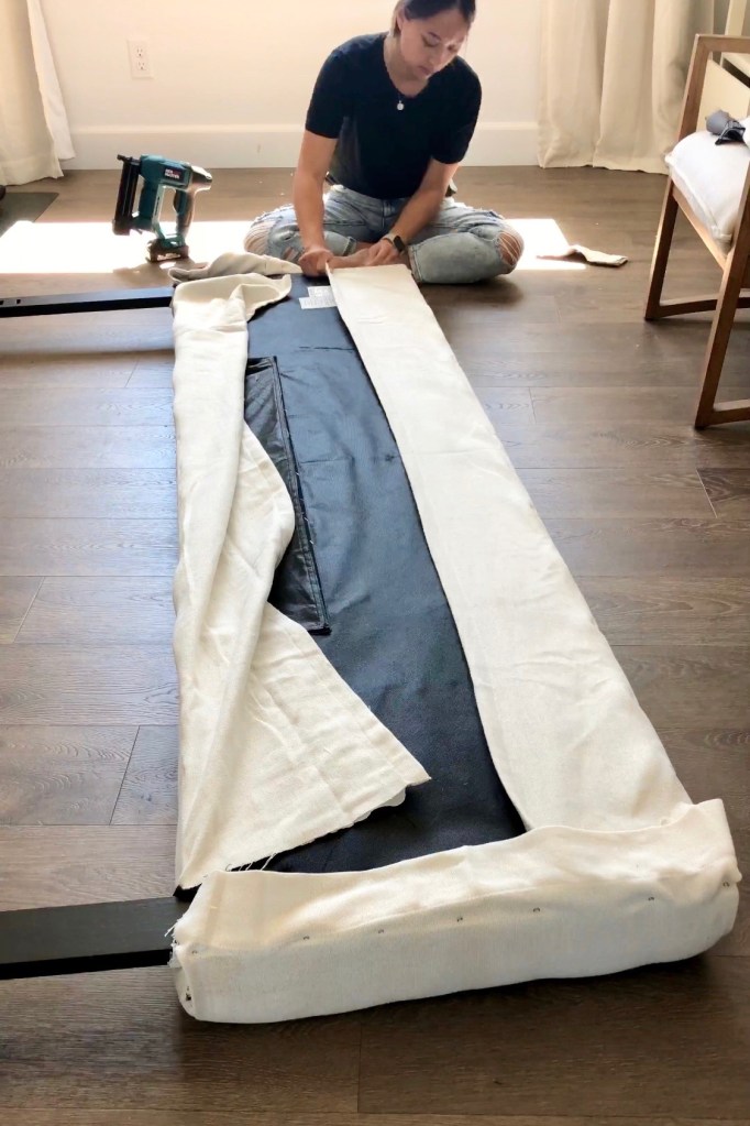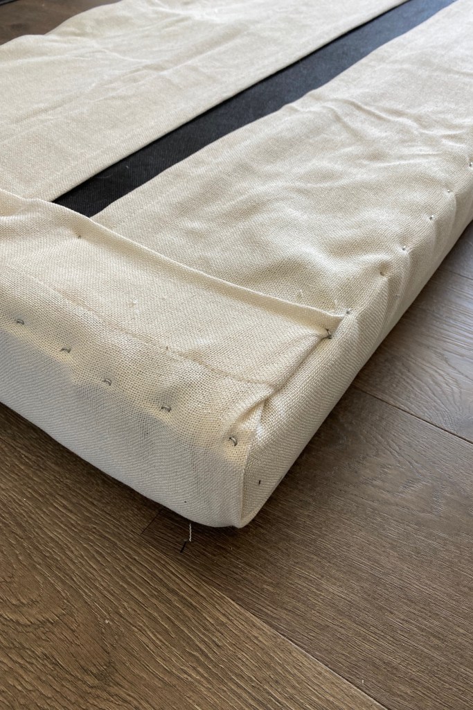 Again, I folded the top piece in, then folded the side piece over the edge, pulled it tot, and stapled it to the headboard.