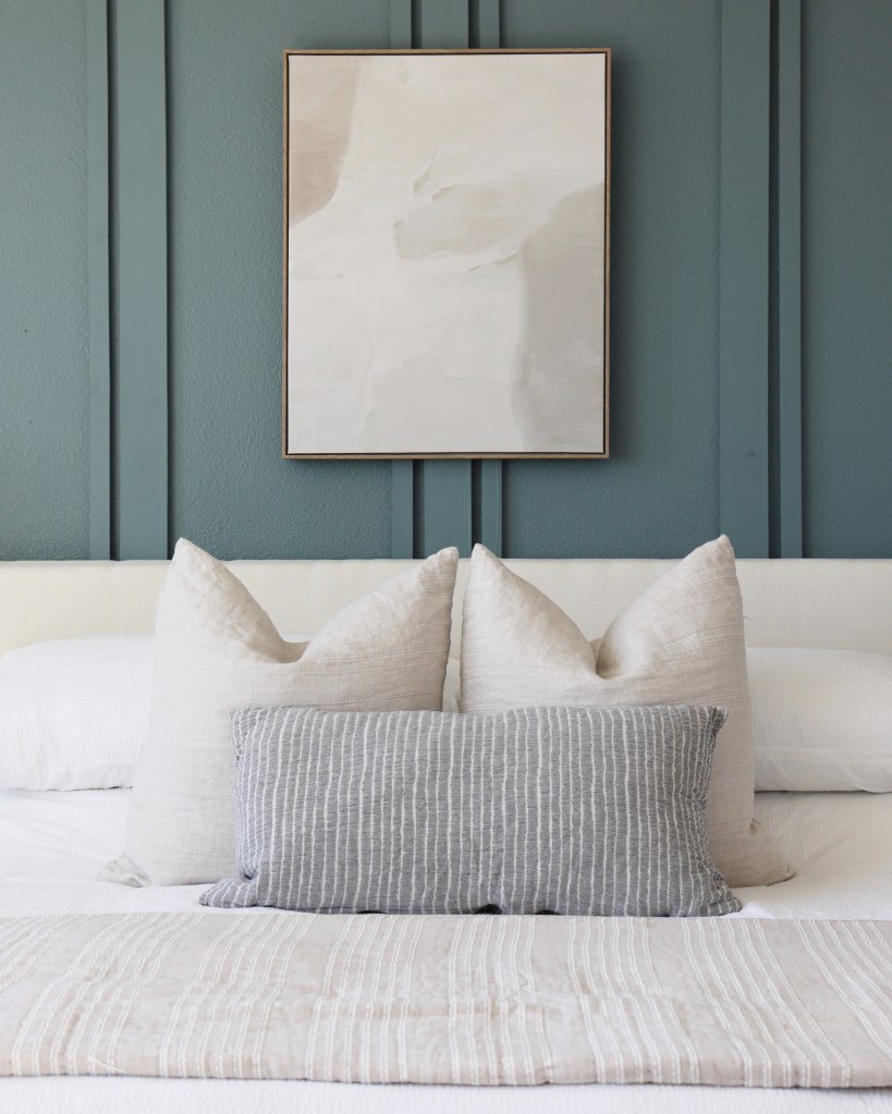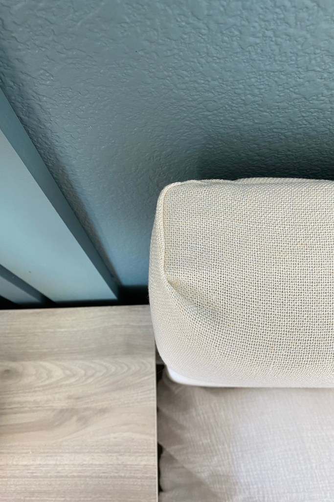 When researching headboards, I envisioned having a simple, modern, beige headboard with no tufts or patterns to compete with our new wood panel walls. I felt that our existing grey tufted headboard would look too dull against our newly painted wall. I wanted a headboard that would help brighten up the space. I decided to use an extra curtain panel that I had to reupholster our old $150 headboard. Because I use those curtains in our bedroom and throughout our house, I knew for sure that the fabric would help the headboard look cohesive in our home.