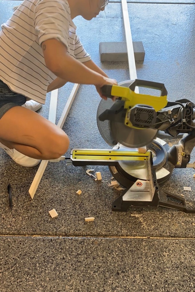 For a more finished look, I built a wooden frame for this piece using 1×2 pine boards that I cut with mitered edges, sanded, stained (using Varathane Flagstone), glued, and nailed together.