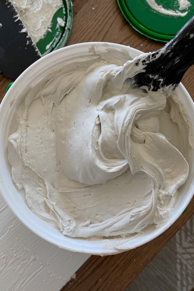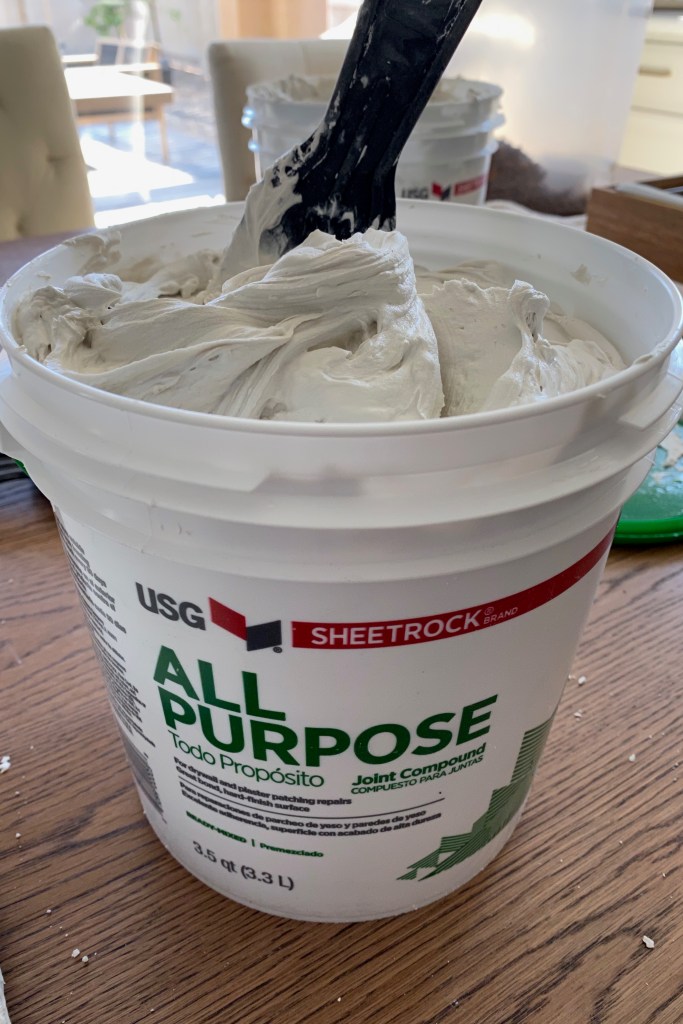 Next, I used some joint compound that I had laying around. I used an all purpose premixed joint compound by USG Sheetrock Brand. Joint compound has a consistency that resembles a thick paste, thick pudding, or cream cheese spread. It’s usually used to repair drywall but is also a great product to use for textured wall art! I’ve also seen some people use wood filler or spackle for this DIY.