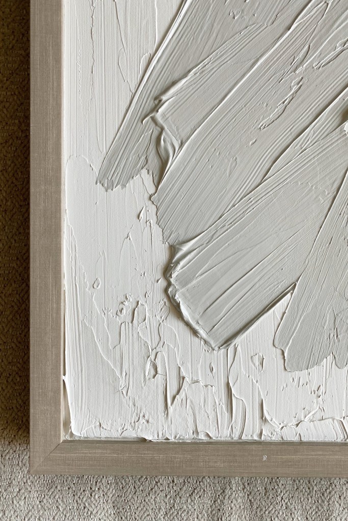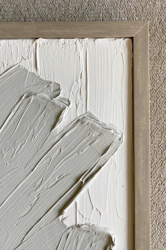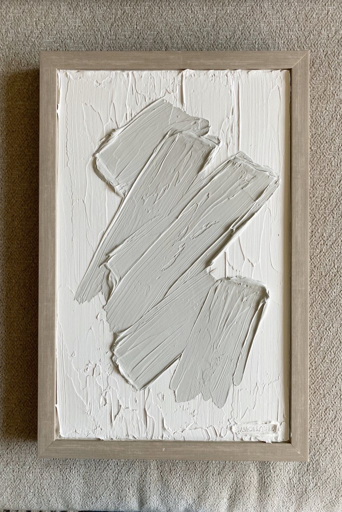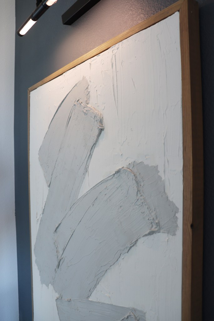 Once I was happy with how my piece looked, I let it dry for approximately 2-3 days. When the piece was COMPLETELY dry and had a chalky feel, I sanded down the bumpy and uneven texture on the edge of the canvas using a sanding block. Then, I painted my faux brush strokes using some leftover wall paint. I used a Repose Gray by Sherwin Williams, color matched with Behr paint at Home Depot. You can also eliminate this step and leave the entire piece white for an even simpler look.