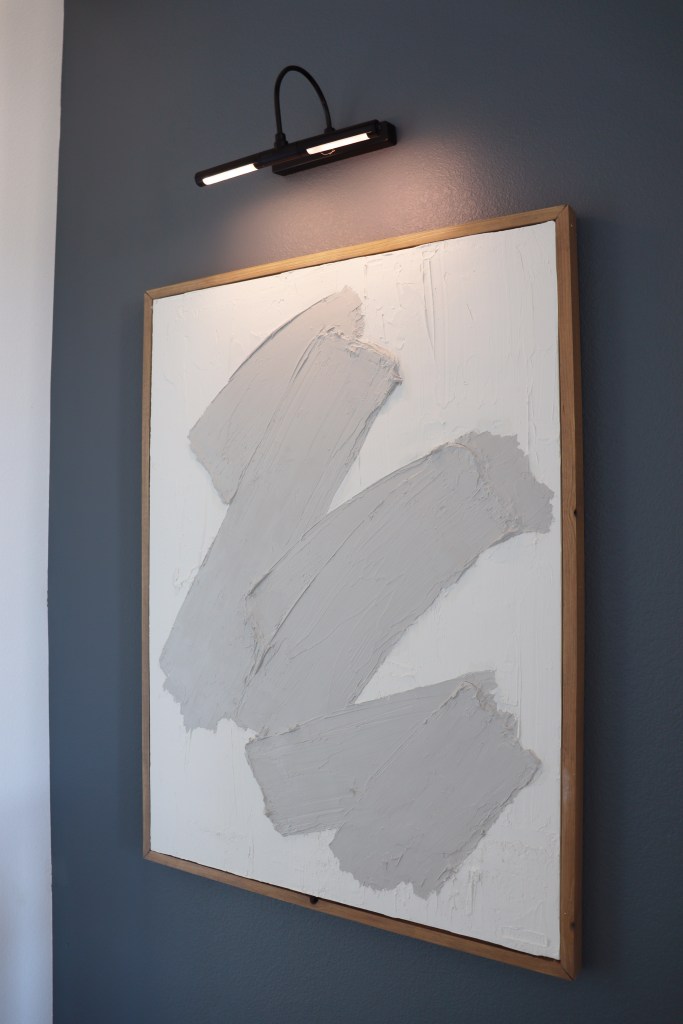 I hammered some sawtooth picture hangers onto the back of the canvas and put up my new favorite piece at the end of our second floor hallway. I also painted the wall a charcoal blue (Ocean Swell by Behr) and added a battery-powered picture light from Amazon (just a 5-minute installation) to make the piece pop a little more.