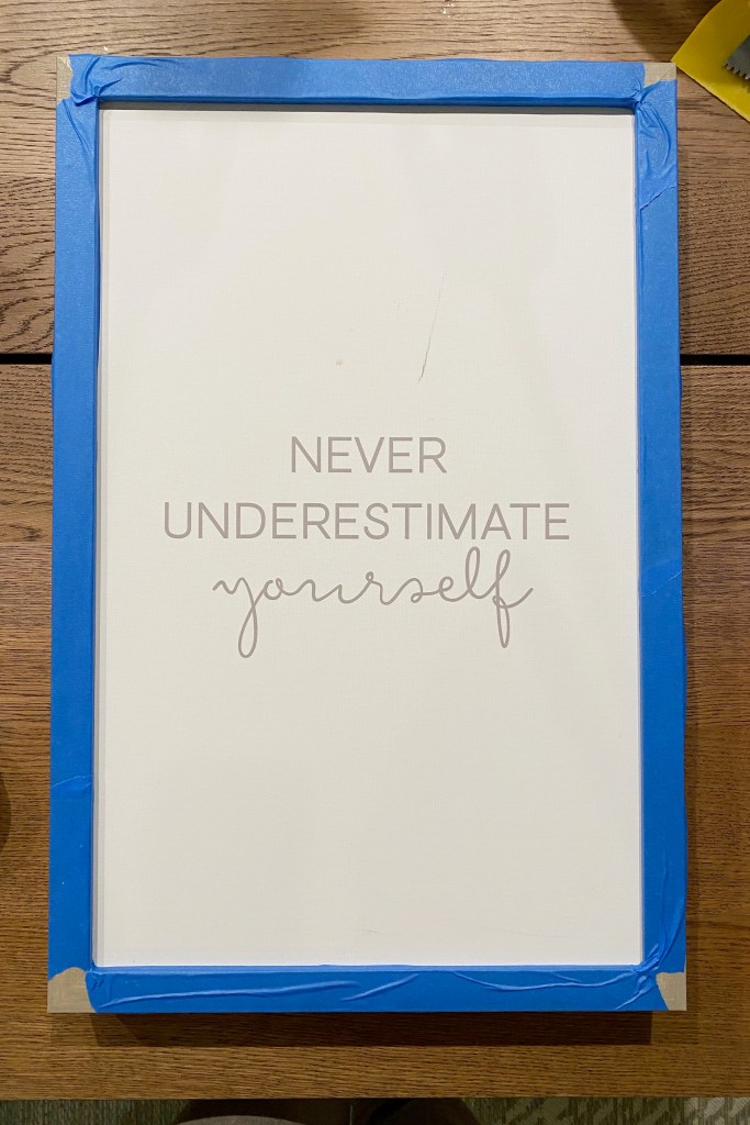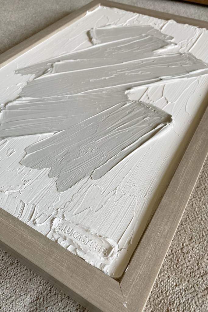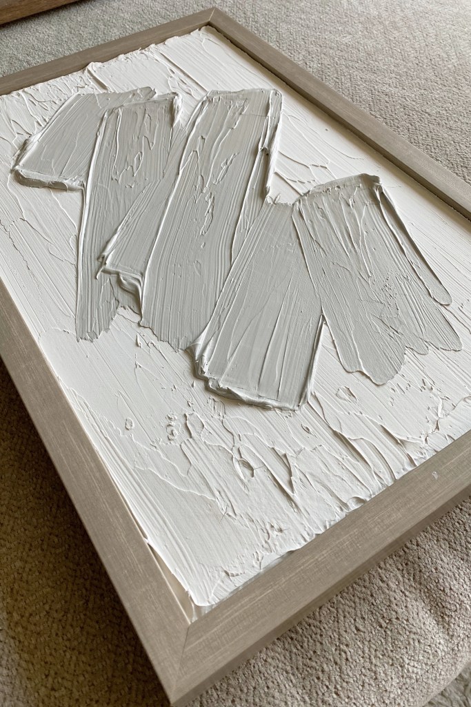 A few months later, I decided to make another version as a gift to a friend. Instead of using a blank canvas and building my own frame, I purchased a framed piece of artwork on clearance at Home Goods in the perfect size with my ideal frame color. I covered the frame with painter’s tape and created another textured art piece over the existing print. This one turned out even better… I almost didn’t give it away!